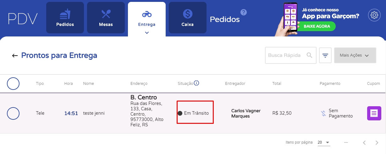Após isto, o sistema mudará a situação do pedido para Em Trânsito.
