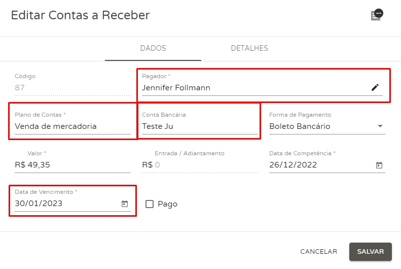 Feito isso, confirme se todos os dados do lançamento financeiro estão corretos. Obrigatoriamente deve ter um Pagadorinformado com CPF/CNPJ e endereço, uma Categoriade receita, uma Conta Bancáriaque emite boleto e a Data de Vencimentodeve ser superior ao dia atual.