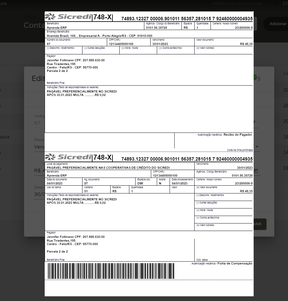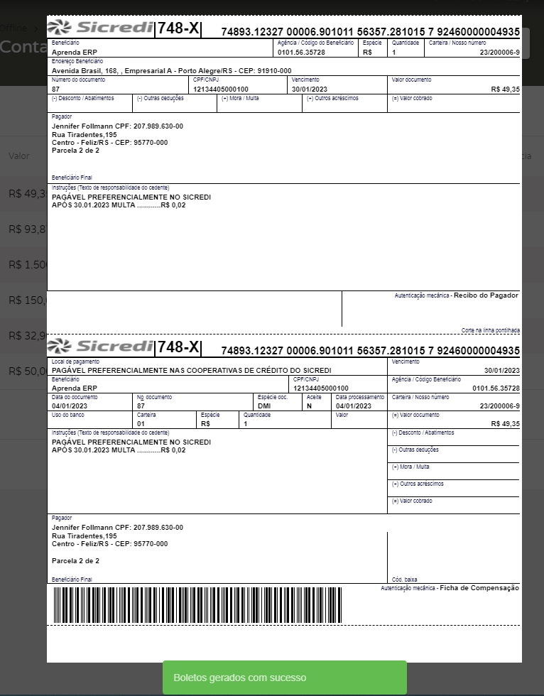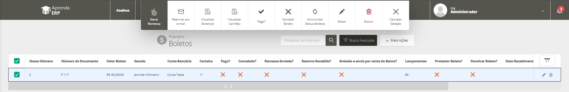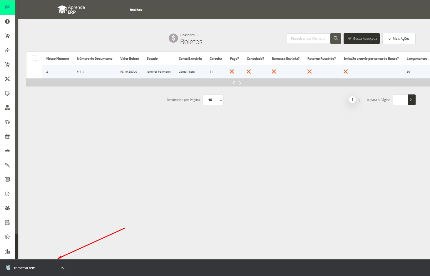 Mas até esse momento, somente foi gerado o boleto bancário no sistema, sem vínculo com o banco. Para que este boleto seja registrado no sue banco, você terá acesso ao Sistema ERP, onde irá gerar a remessa dos boletos emitidos e enviará ao seu banco.