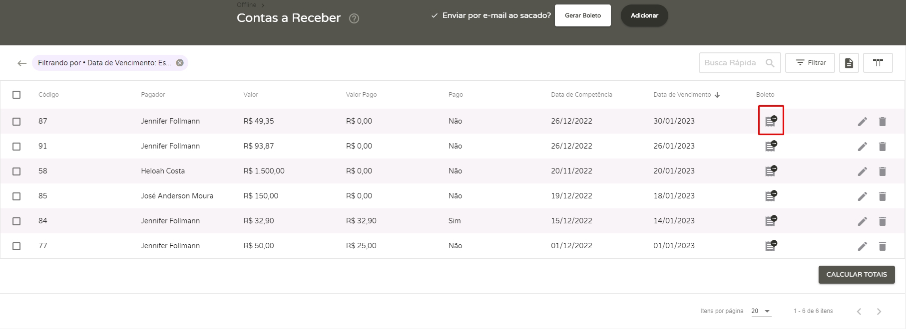 Outra possibilidade de gerar o boleto é através da listagem de contas a receber. Você poderá gerar o boleto através da lista de lançamentos quando tem a certeza de que todas as informações estão preenchidas corretamente. Sendo assim, localize o registro desejado e clique no ícone de Gerar Boleto.