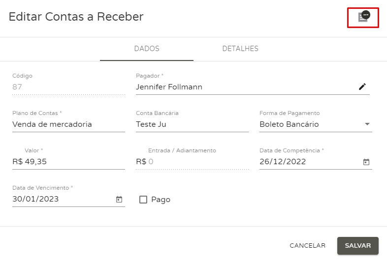 Assim que conferir todas as informações, você poderá emitir seu boleto pela edição do lançamento, ao clicar no ícone Gerar Boleto, no topo da tela.