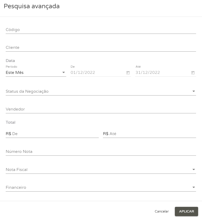 Código:informe o código da venda; Cliente:informe o cliente que deseja buscar as vendas; Data:informe o período de tempo no qual deseja realizar a busca; Status da negociação:informe o status que se encontra a venda; Vendedor: informe o vendedor que deseja buscar as vendas; Total:informe o valor médio de busca que deseja localizar; Número da Nota:informe o número da nota referente a venda; Nota Fiscal:aqui informe a situação na qual se encontra a nota fiscal; Financeiro:nesse campo informe se o financeiro já se encontra realizado ou não. Logo, clique em Aplicarpara realizar a busca.