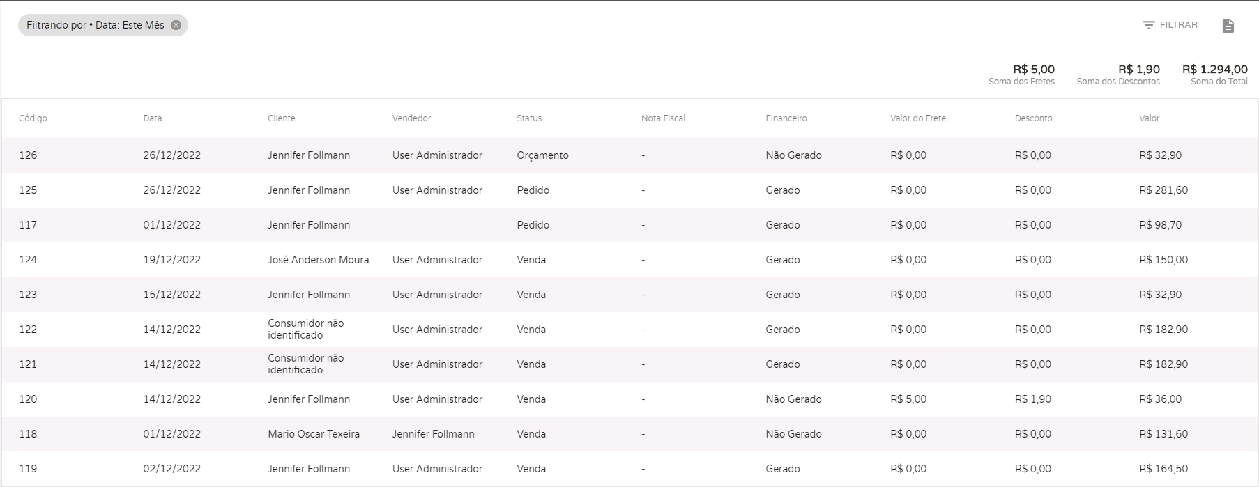 Código:o sistema apresentará o código da venda; Data:o sistema apresentará a data de alteração da venda; Cliente:o sistema apresentará o nome do cliente da venda; Vendedor:será informado o vendedor que realizou a venda; Status:o sistema apresentará o status da venda; Nota Fiscal:o sistema apresentará se já existe uma nota emitida para essa venda; Financeiro:será informado se o financeiro já está gerado ou não; Valor do frete:caso tenha sido cobrado frete o sistema apresentará o valor equivalente; Desconto (R$):o sistema apresentará o valor de desconto da venda; Valor (R$):o sistema apresentará o valor total da venda.