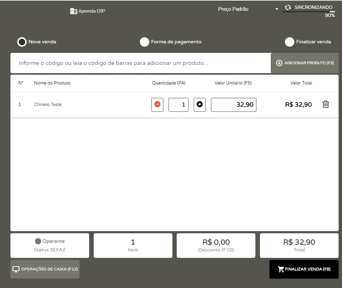 Primeiramente, abra o seu Offline, acesse a tela do PDVe adicione um produtoqualquer na venda.