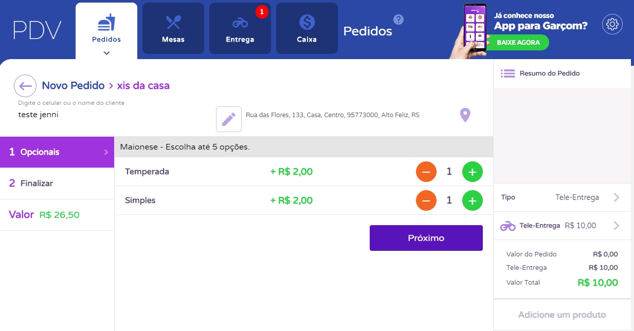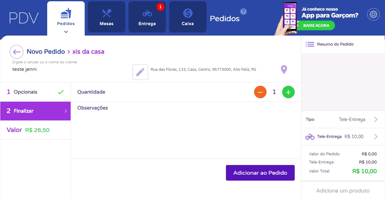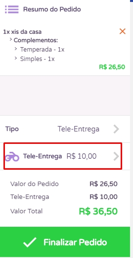 Além disso, no campo à direita da tela, você poderá verificar um resumo do pedido realizado, onde informa os produtos adicionados e seus complementos e os detalhes do valor. Caso você não tenha a taxa de entrega cadastrada no cliente ou nas configurações, clique sobre o campo Tele-Entrega e informe o valor desejado.