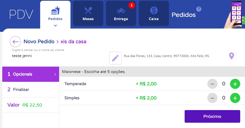 A seguir, caso o produto tenha complemento, selecione a quantidade de complementos que está sendo solicitada pelo cliente.