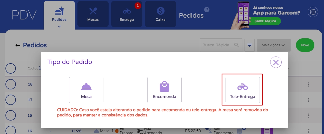 Nesse momento, se abrirá o painel de controle de pedidos. Clique em Novo e em Tipo de Pedido, selecione Tele-Entrega.