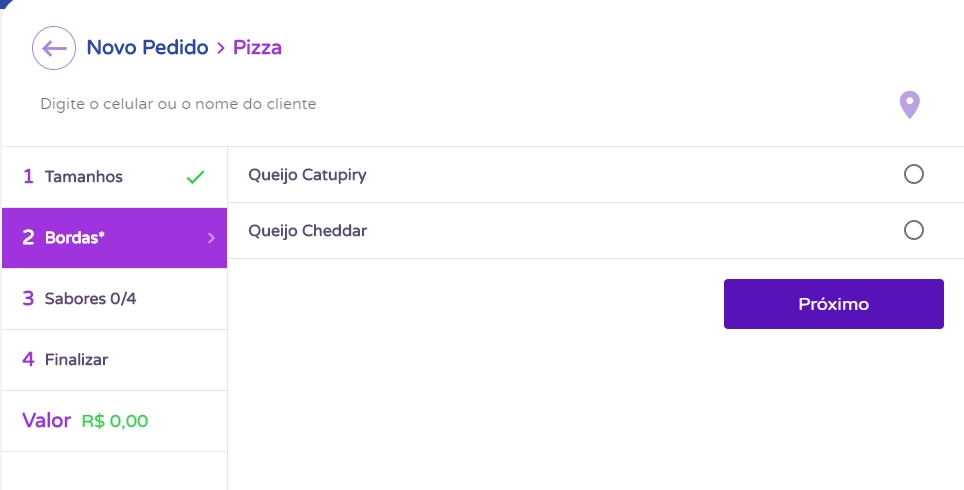 Na seção bordas caso seja solicitado por seu cliente selecione a borda na qual irá acompanhar a pizza. Para isso, selecione o campo no fim das descrições.