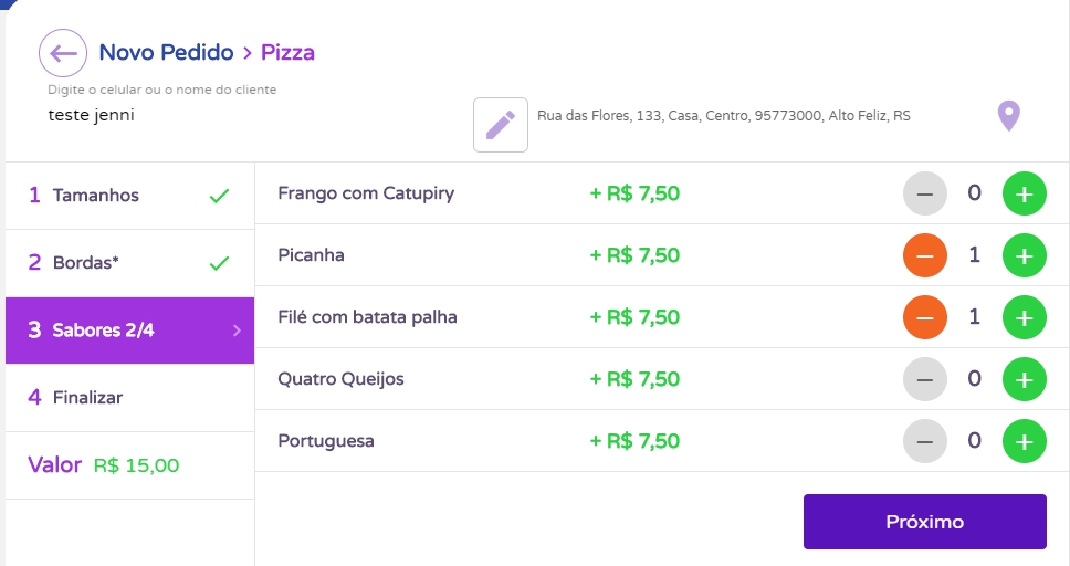 Então, informe os sabores que compõem a pizza de seu cliente, clicando no ícone de + para adicionar e – para retirar.