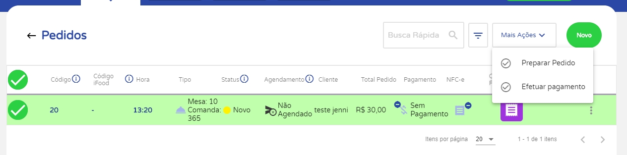 E pronto! O seu pedido será apresentado na tela de pedidos para finalização. Para isso, basta selecioná-lo e clicar em Mais Ações, assim será possível dar início a preparação ou efetuar o pagamento.