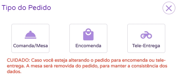 Logo, na tela de pedidos clique no ícone Novoe selecione o Tipo do Pedido, se será Mesa, Encomenda ou Tele-Entrega.