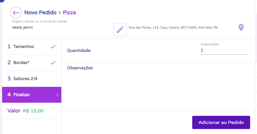 Em Finalizar, será possível informar a quantidade de pizzas que o cliente deseja comprar da mesma pizza, e se necessário, será possível adicionar alguma observação para o preparo.