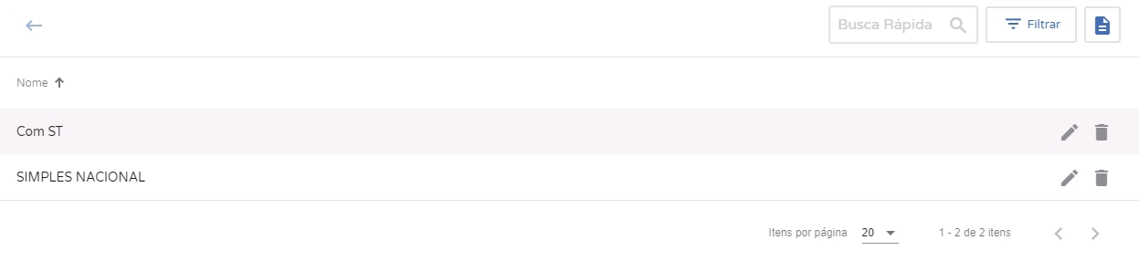 Nome:Será informado o nome do grupo tributário; Para editarou apagarclique nos ícones informativos no fim das descrições (lápis e lixeira), vale ressaltar que não será possível excluir um grupo tributário que possua vínculos sem que o mesmo também seja excluído.