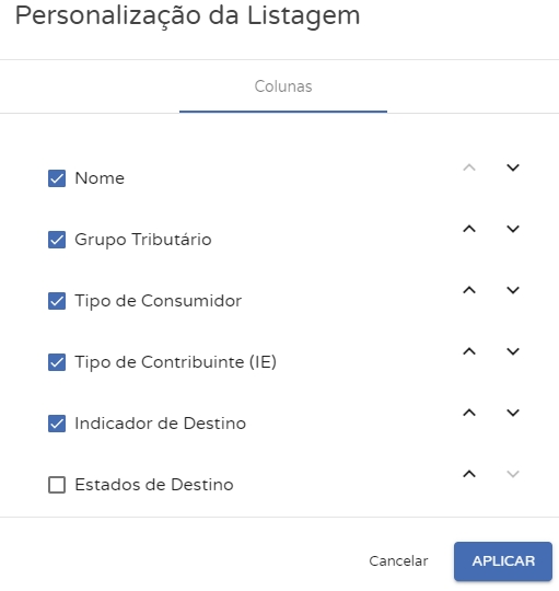 Nele será possível acrescentar ou retirar colunas de visualização de acordo com as disponibilidade de informações, juntamente com a possibilidade de modificar seu posicionamento. Após a edição, clique em Aplicarpara validar as alterações.