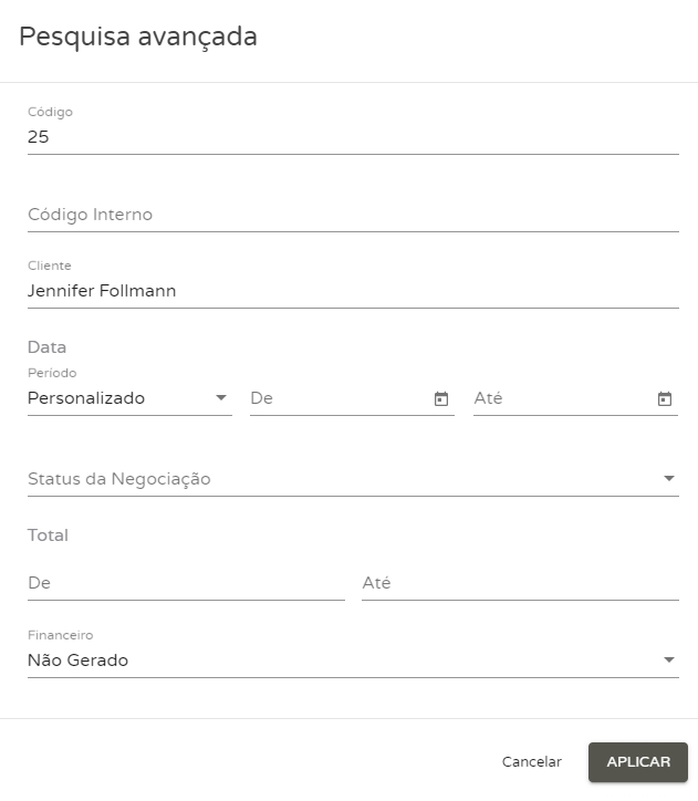 Código:informe o código da OS; Código interno:informe o código interno da OS Cliente:informe o cliente que deseja buscar; Data:informe o período de tempo no qual deseja realizar a busca; Status da negociação:informe o status que se encontra a Ordem de Produção; Total:informe o valor médio de busca que deseja localizar; Financeiro:nesse campo informe se o financeiro já se encontra realizado ou não. Logo, clique em Aplicarpara realizar a busca.