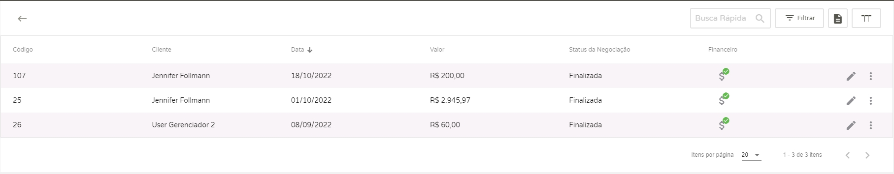 Código:o sistema apresentará o código da OP; Código interno:será informado o código interna da Ordem de produção; Cliente:o sistema apresentará o nome do cliente; Data:o sistema apresentará a data de alteração; Valor (R$):o sistema apresentará o valor total; Status da Negociação:o sistema apresentará o status da venda; Financeiro:será informado se o financeiro já está gerado ou não.