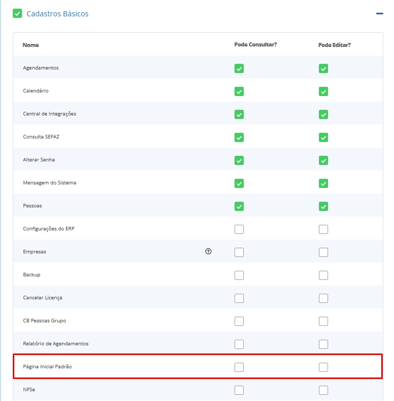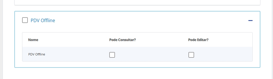 Agora, já será possível visualizar o módulo PDV Offline. Ao expandir a opção nesta tela, teremos apenas 02 opções: "Pode Consultar?" e "Pode Editar?"