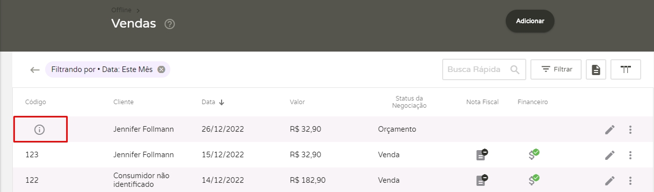 Quem gera o código das vendas é o Sistema ERP, assim, quando você realiza uma venda através do Offline, é preciso aguardar a sincronização entre o Offline e o Sistema ERP. Após sincronizar as vendas, o sistema apresentará o código da venda.