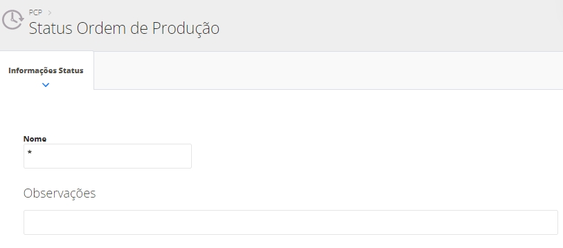 Nome: informe o nome desse status, de acordo com a organização da produção da sua empresa. Por exemplo, montagem, embalagem, finalização. Observações: adicione alguma observação para esse status, caso desejar.