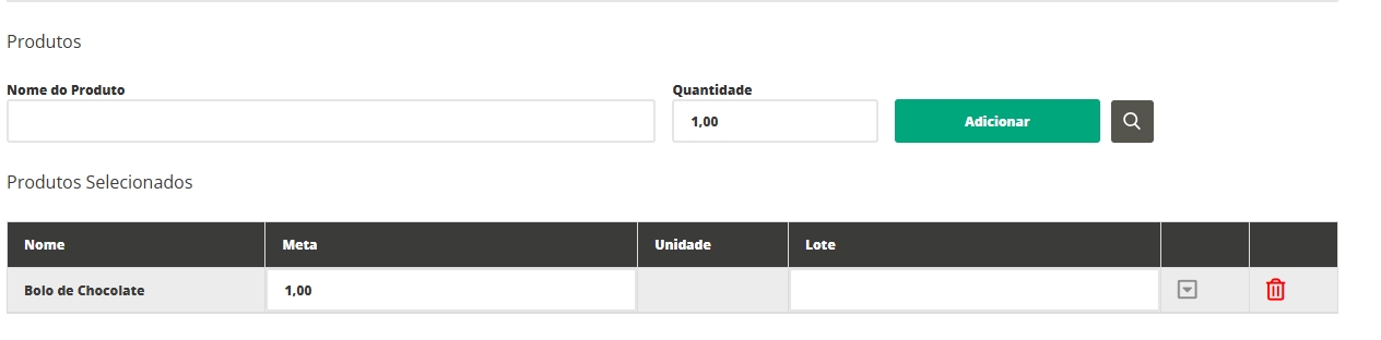 Produtos: informe neste campo o produto acabado que será produzido. Busque o produto pelo nome ou código, e depois clique em Adicionar; Meta: informe a quantidade do produto a ser produzida nesta ordem de produção; Lote: informe o lote do produto que será produzido, se houver.