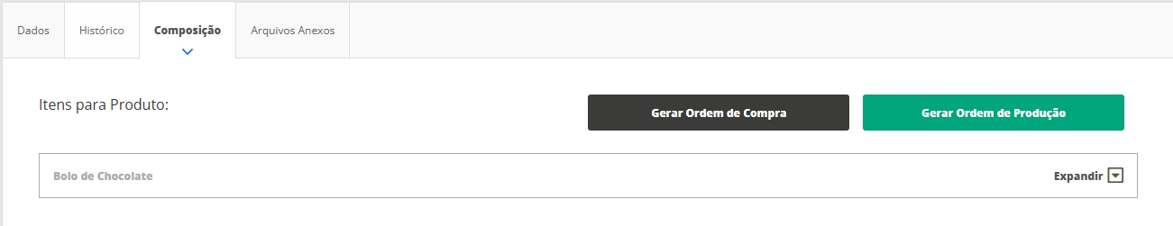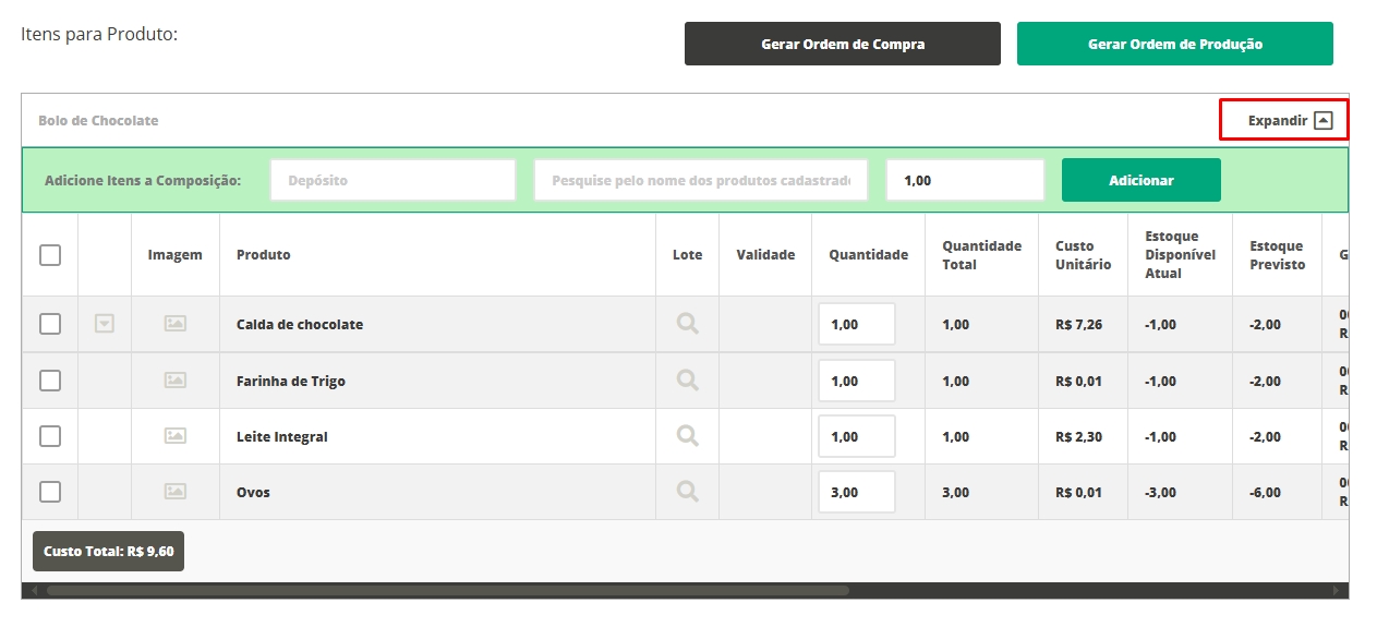Ao expandir a composição do produto, você encontra os seguintes dados: Imagem: será a imagem selecionada como principal dentro do cadastro do produto, na aba Fotos; Produto: será o nome informado no cadastro do produto; Lote: para selecionar o lote do produto, basta clicar na lupa, assim o sistema irá trazer a listagem e você poderá selecionar o lote desejado; Validade: o sistema trará a validade informada no Lote; Quantidade: neste campo deve ser informada a quantidade do item a ser utilizada para a produção de uma unidade do produto acabado; Quantidade total: o sistema irá informar a quantidade total utilizada daquele insumo, de acordo com o total produzido. O sistema apresentará esta informação de acordo com a configuração realizada anteriormente; Estoque atual: será a quantidade que há em estoque deste produto na hora de iniciar a produção; Estoque previsto: será a quantidade que está prevista para o estoque após a produção ser finalizada; Gênero: esta informação será de acordo com a selecionada em Tipo/Gênerono cadastro do produto; Depósito de origem: será de onde o sistema irá realizar a saída dos produtos para a produção do produto acabado; Observações: o sistema trará a informação cadastrada no composto dentro da aba Composiçãono cadastro do produto acabado;