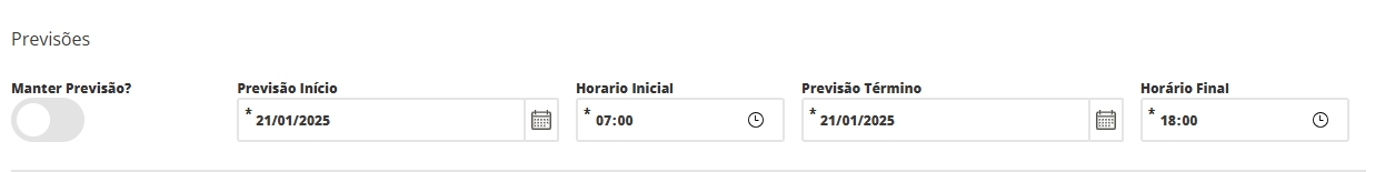 Manter Previsão: selecione este checkbox se deseja que, ao finalizar a Ordem de produção, no campo de Data Términoo sistema informe os mesmos dados dos campos Previsão Términoe Horário Final; Previsão de Início: selecione a data prevista para o início da produção do item; Horário Inicial: selecione o horário em que a ordem de produção será iniciada; Previsão Término: informe a data de previsão de término da produção; Horário Final: selecione o horário em que a ordem de produção será finalizada.