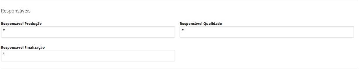 Responsável Produção: selecione o usuário do sistema que é responsável pela execução da ordem de produção. Somente o usuário informado neste campo poderá dar início à produção; É Responsável por Finalizar?: marcando este checkbox o sistema irá automaticamente preencher Responsável Finalizaçãode acordo com o usuário informado em Responsável Produção. Logo, somente este usuário poderá finalizar a produção; Responsável Qualidade: informe o usuário do sistema que é responsável pela verificação de qualidade do produto produzido. Assim como os demais responsáveis, somente este poderá realizar a aprovação da qualidade; Responsável Finalização: caso não tenha habilitado o campo É Responsável por Finalizar, informe o usuário do sistema que é responsável pela finalização da ordem de produção. Logo, somente este usuário poderá finalizar a produção.