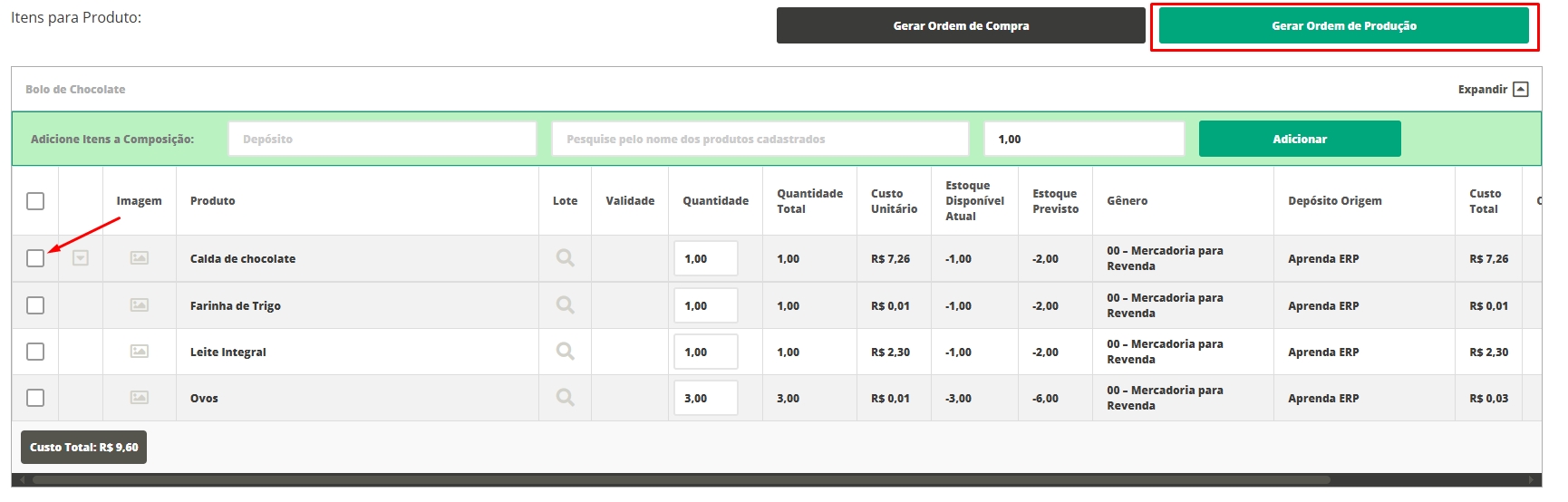 Caso algum item da composição não possuir estoque suficiente, você poderá gerar uma Ordem de Compradentro da Ordem de Produção. É muito simples, basta você selecionar o(s) produto(s) desejado(s) e clicar em Gerar Ordem de Compra, assim o sistema irá abrir uma nova guia com a ordem de compra, basta apenas preenchê-la e enviá-la.