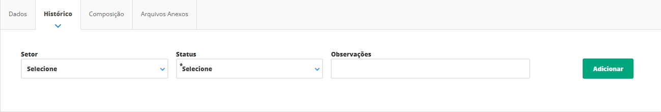 Setor: você irá informar o setor em que a produção se encontra. Status: você irá informar um status para a produção no setor selecionado. Observações: você poderá adicionar uma observação sobre a produção neste campo. Após informar os dados, clique em Adicionar.