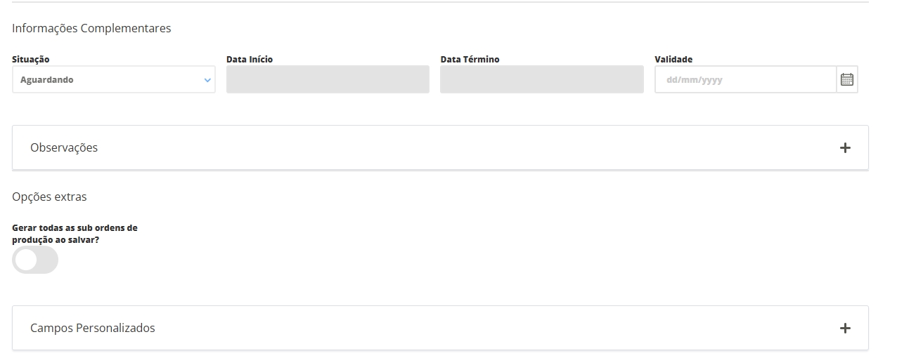 Situação:a situação sempre será preenchida automaticamente conforme o andamento da ordem de produção dentro do sistema; Data Início: o sistema trará a data e horário que a ordem de produção foi iniciada; Data Término: o sistema trará a data e horário que a ordem de produção foi finalizada; Validade: caso o item produzido seja controlado por data de validade, informe-a nesse campo; Observações: neste campo de texto livre, você poderá digitar observações sobre a produção do item se necessário. Campos Personalizados: são os campos cadastrados em Atributos para informações personalizadas.