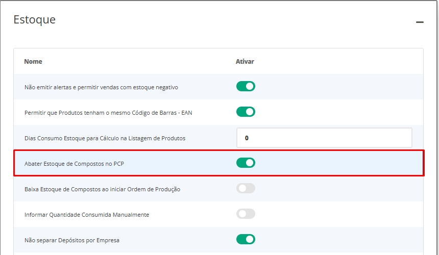 Como você irá realizar ordens de produção para produzir os produtos acabados, você deverá habilitar a opção Abater Estoque de Compostos no PCP. Caso você não configure desta forma, a baixa do estoque da composição será realizada no momento da venda. Mas além dessa, você também tem a opção de habilitar o campo Baixa do Estoque ao Iniciar Ordem de Produção. Assim, quando você estiver iniciando a OP, ocorrerá automaticamente a baixa dos produtos da composição. Ao contrário, a baixa ocorrerá no momento de finalizar a OP.