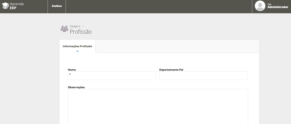 Nome: informe um nome para identificação da nova profissão; Departamento Pai: selecione o departamento responsável pela profissão. Este departamento precisa estar previamente cadastrado no sistema; Observações: inclua alguma observação para a profissão, como as atribuições ou exigências da mesma. Após preencher estas informações, clique em Salvar.