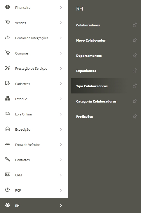 Outra possibilidade de controle de colaboradores dentro do ERP é através dos tipos de colaboradores. Os tipos são as formas de contratação do colaborador, por exemplo: estagiário, assalariado, terceirizado, entre outros.