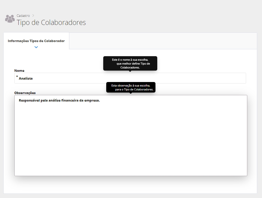 Nome: informe um nome para o seu tipo de colaborador; Observações: você poderá adicionar uma breve observação sobre o tipo do seu colaborador. Após preencher essas informações, basta clicar em Salvar.