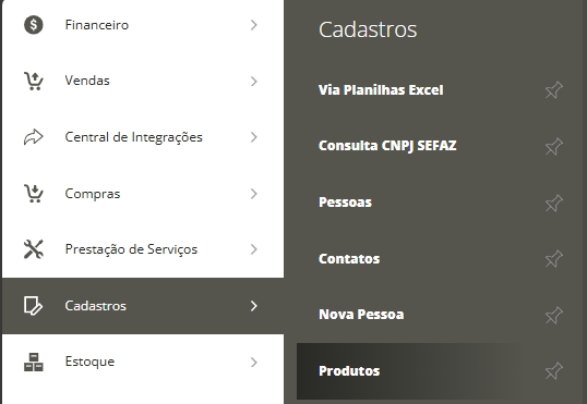 Ao criar o atributo inicialmente, o campo será disponibilizado para preenchimento no cadastro do item. Para estar efetuando a configuração, acesse Menu Lateral Cadastros e em seguida Submenu Produtos