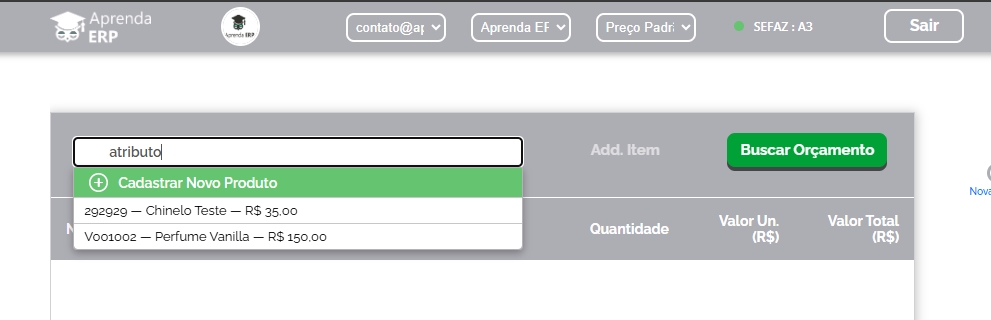 No campo Localizar Produto ou Serviçopreencha com o nome do atributo que foi criado e preenchido no cadastro dos itens