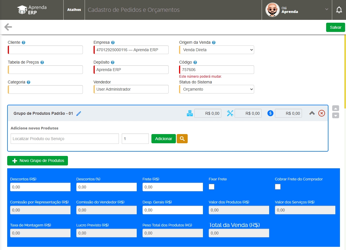Em seguida clique em Novo, onde será aberta a tela de um novo Orçamento