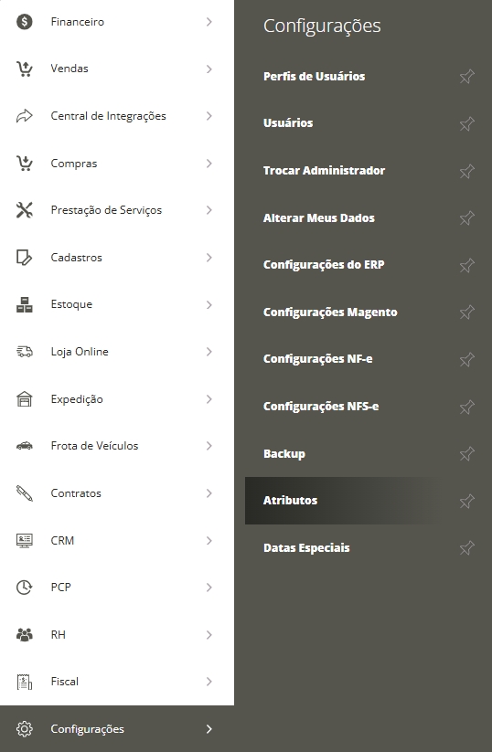 Nesta primeira etapa, é necessário efetuar a configuração do atributo e deixa-lo disponível para busca em suas novas vendas. Para isso, acesse Menu Lateral Configurações e em seguida Submenu Atributos