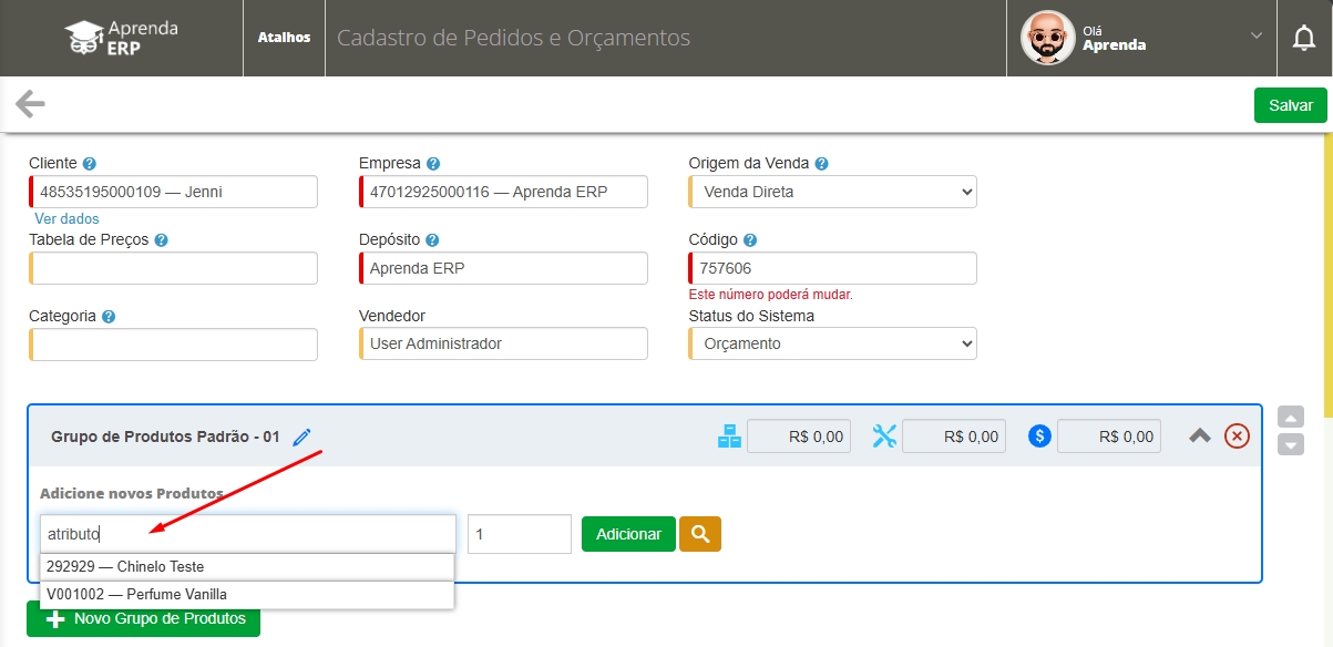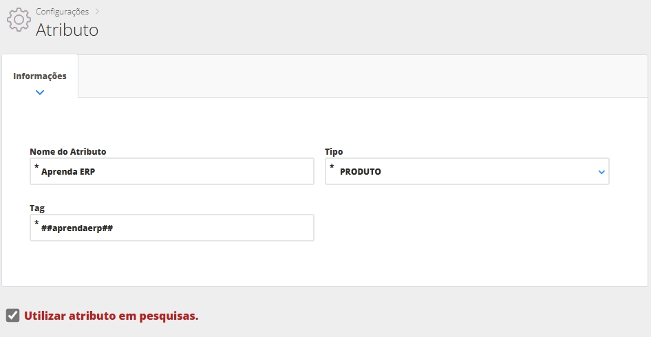 Preenchido o campo com a informação do atributo para utilização do mesmo para busca nas telas de novas vendas, basta estar clicando em Salvar.