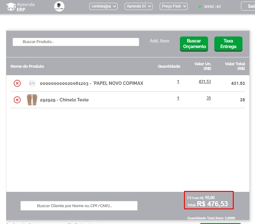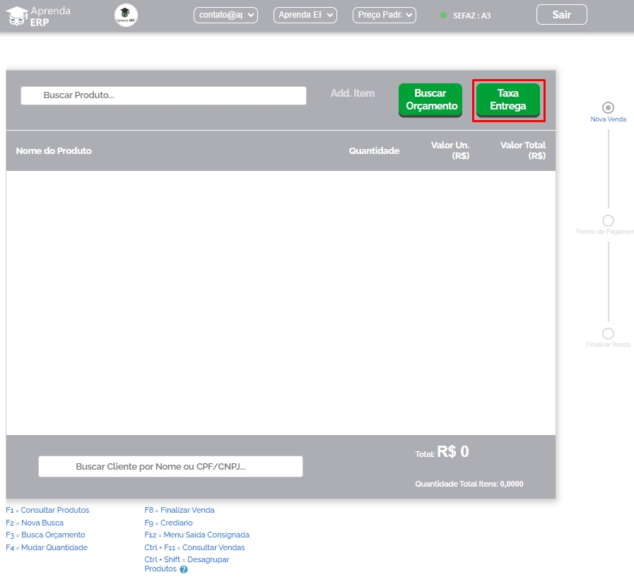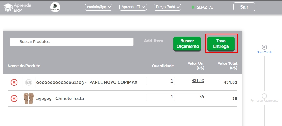 Informe os itens que compõem a sua venda, e em seguida clique em Taxa Entrega