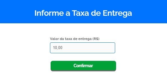Então será aberta uma nova tela, onde será informado o valor em R$ que é cobrado pela taxa de entrega e em seguida clique em Confirmar para adicionar a informação
