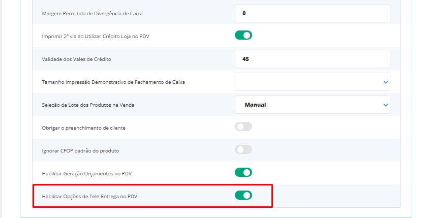 Expanda o ícone do PDV e selecione a opção Habilitar Opções de Tele-Entrega no PDVe salve as alterações