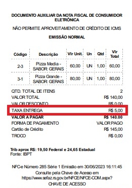 Ao clicar em confirmar, será possível visualizar na tela do PDV o valor da venda e o valor da taxa de entrega