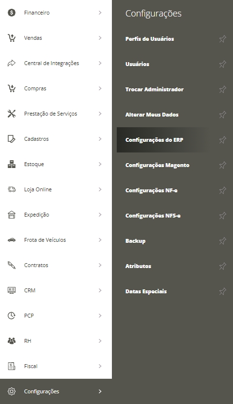 Acesse Menu Lateral Configuraçõese em seguida clique no Submenu Configurações do ERP