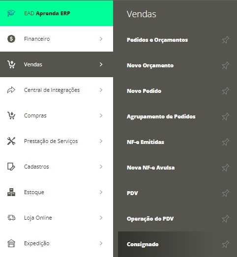 Acesse Menu Lateral Vendas, em seguida clique em Consignado e então em Nova Saída Consignada.