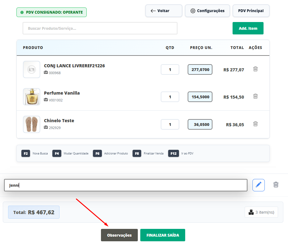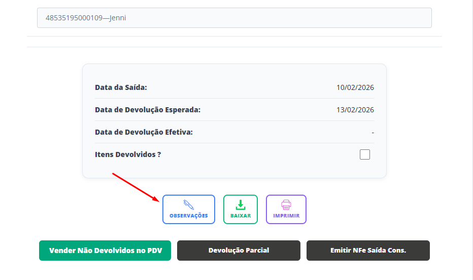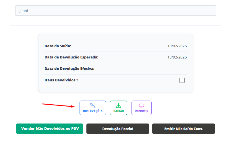 Feito isso, insira o nome de seu cliente que irá levar essa mercadoria no consignado e visualize que será disponibilizado o campo Observações.