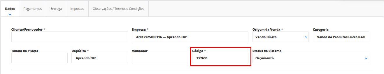 Agora, após o sistema apresentar a tela para preenchimento de dados, busque pelo campo Código.