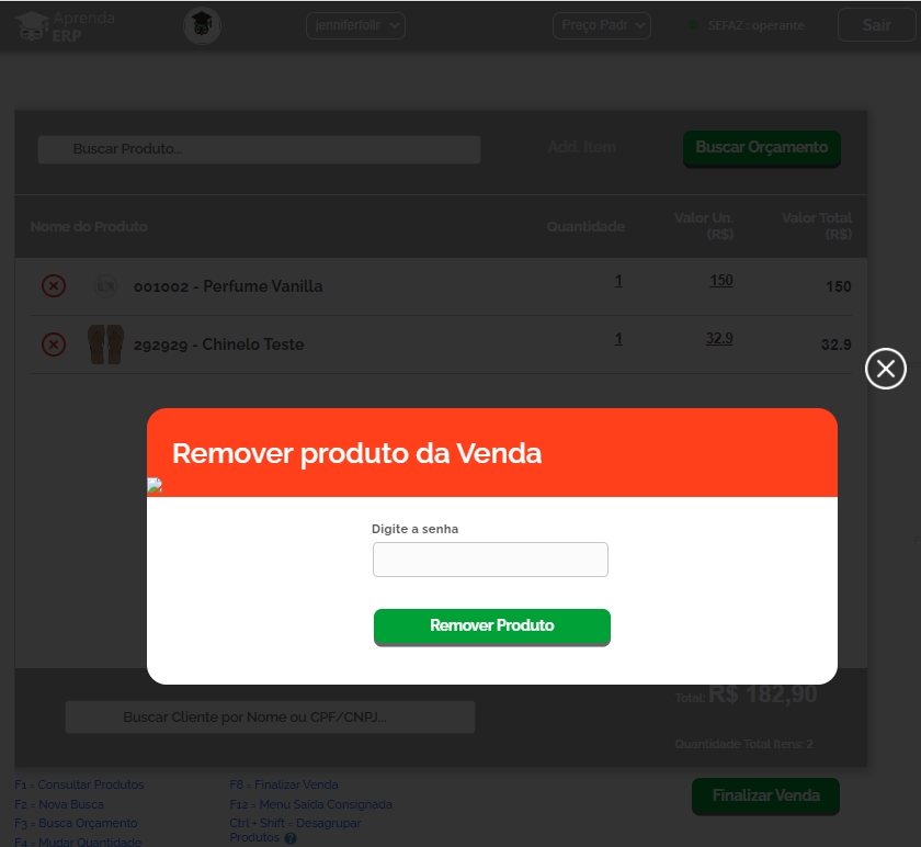Ao clicar na lixeira para excluir, será apresentado ao usuário que esta logado no ERP, a senha de exclusão