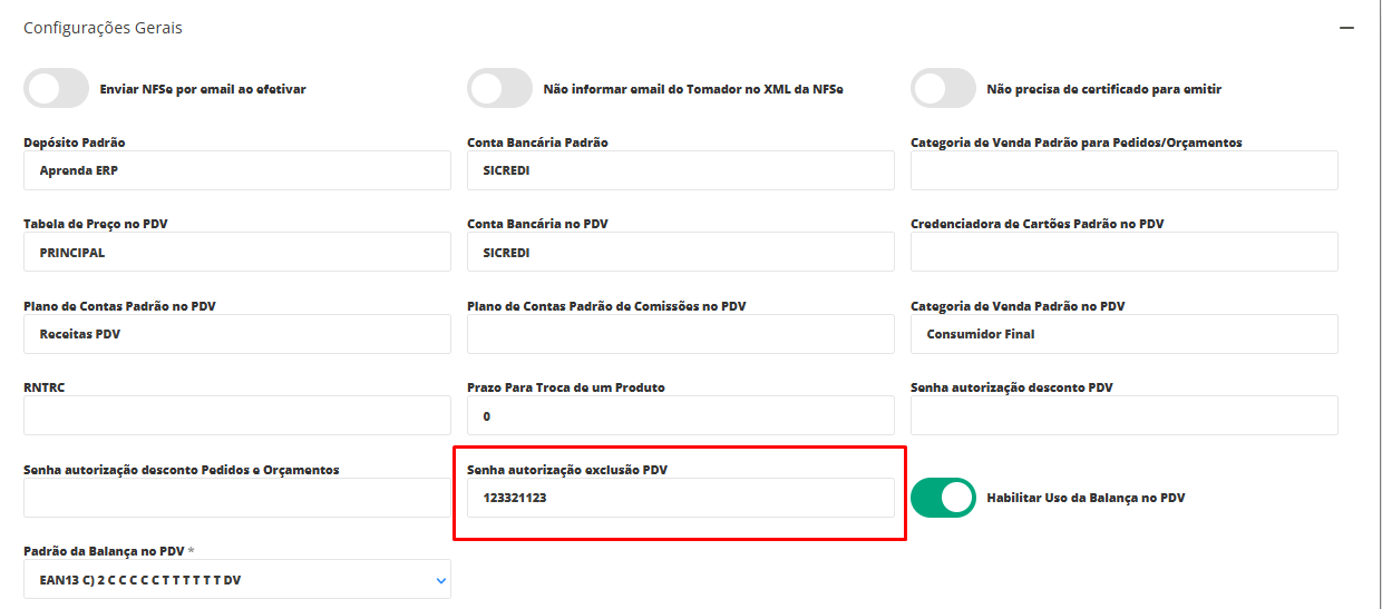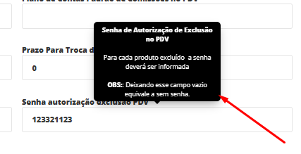 Onde irá visualizar o campo Senha autorização exclusão PDV