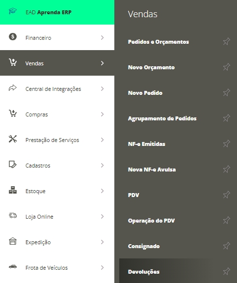 - Através do menu lateral Vendas, submenu Devoluções. Em seguida, clique em Novo.